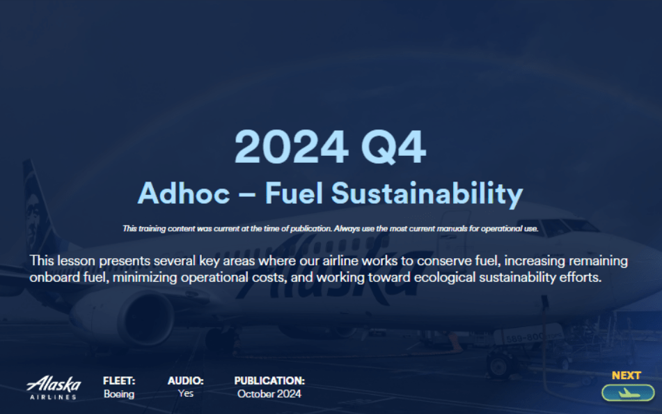 To support airline-wide fuel reduction efforts without compromising safety, I helped develop a brand-new quarterly recurrent course for the Boeing 737 pilot group. The course used a short, high-impact simulation format—15 minutes, story-driven, and interactive—designed to shift pilot perception from “these things don’t matter” to “small changes scale across the operation.”